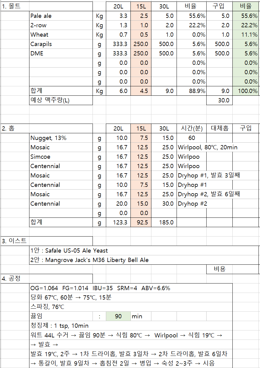 추가 워트 SG=1.023, 2L → 물 1L 추가 후 50분간 끓임 → 설탕과 DME를 섞어서 50g 추가 → 10분간 더 끓임 → 18℃로 식힘 → 워트 2L, SG=1.064 확보 → 1차 드라이홉을 하는 발효 3일차에 워트에 추가 → 맥주 2L 추가 확보 ^^;
